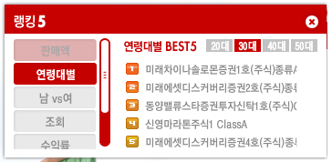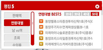 특히, 30대와 40대에 선택한 펀드들이 동양종금증권에서 펀드 판매액 BEST5안에 모두 드는 펀드들이라는 점 역시 눈여겨 볼 만하지 않을까 합니다.