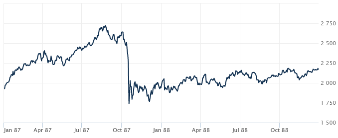 다우존스 산업 평균 지수 (DJIA) 차트에서도 확인할 수 있는 것 처럼 1987년 10월 19일 상당 수준의 미국 증시 지수 폭락이 발생했는데요.